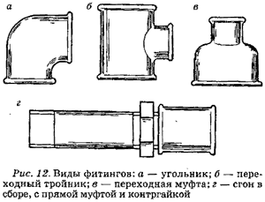 Для этого необходимо подобрать соединительную арматуру — фитинги (рис. 12). Они понадобятся для сборки отдельных участков трубопровода, для временной заглушки концов и устройства ответвлений. Фитинги могут быть изготовлены из стали или ковкого чугуна. Последние имеют утолщения-буртики по краям, а